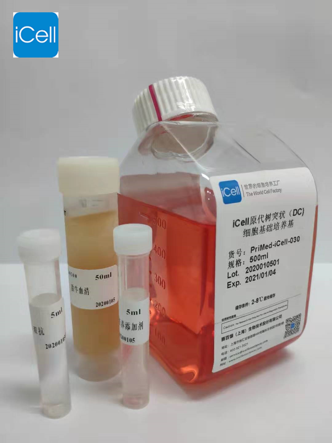 iCell原代DC細胞培養(yǎng)體系是一個為體外生長的人、大鼠、小鼠、兔等哺乳動物的DC細胞設計的理想的完全培養(yǎng)基方案。本體系是一個基于碳酸氫鹽的緩沖體系,可以在孵育的5%的CO2的氣體環(huán)境下維持一個圍繞pH7.2的酸堿緩沖體系。本體系是一個無菌的液體混合系統(tǒng),其中包含必須和非必須氨基酸、維生素、激素、微量元素、GM-CSF等生長因子和一些其他的有機和無機化合物以及胎牛血清(10%)。本培養(yǎng)體系是基于固定配方配制的液態(tài)培養(yǎng)體系,可以為體外培養(yǎng)的人、大鼠、小鼠、兔等哺乳動物的DC細胞提供一個確定適宜的平衡營養(yǎng)環(huán)境,并且可以選擇性的維持DC細胞的生存。